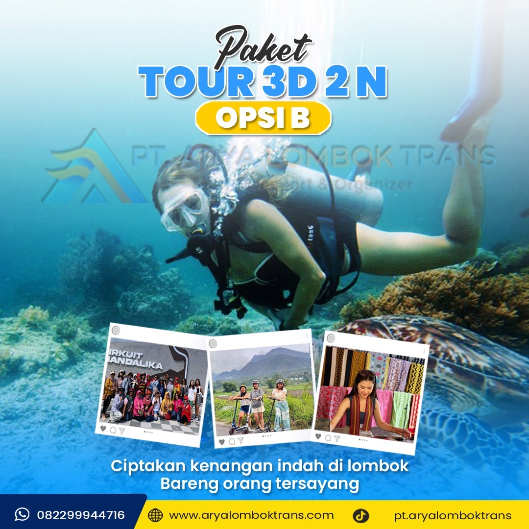 Nikmati petualangan seru bersama Arya Lombok Trans selama 3 hari 2 malam Paket Tour Opsi B. Didesain untuk Anda yang ingin menjelajahi destinasi populer dan hidden gem dalam waktu singkat namun tetap berkesan. Termasuk transportasi, akomodasi nyaman, serta itinerary fleksibel yang cocok untuk liburan keluarga, pasangan, atau rombongan kecil.